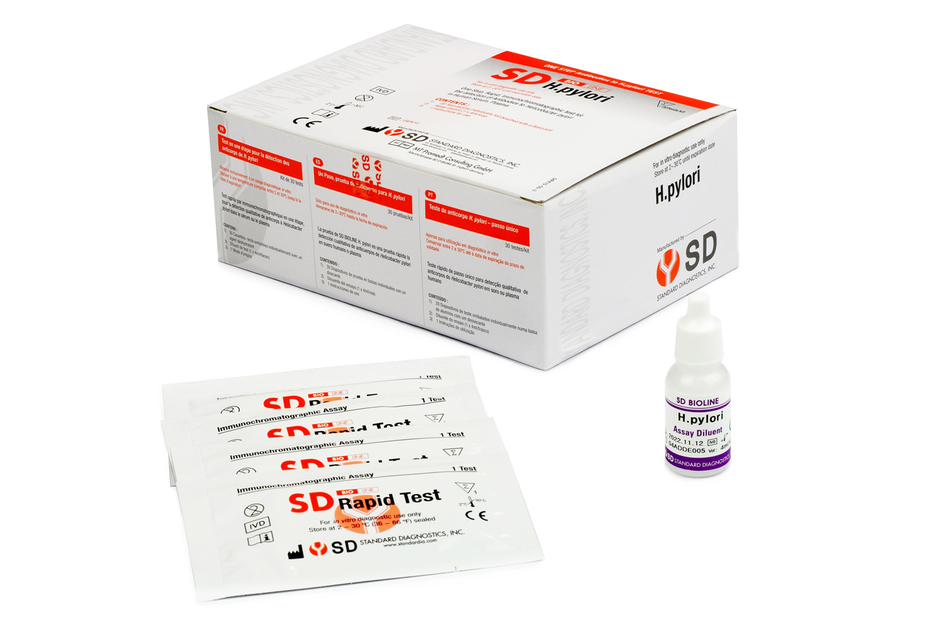 The SD BIOLINE H.pylori test is a rapid test for the qualitative detection of antibodies of all isotypes (IgG, IgM, IgA, etc) specific to Helicobacter pylori in human serum or plasma. This test kit is intended as an aid in the diagnosis of H. pylori infection in patients with gastrointestinal symptoms. The SD BIOLINE H.pylori kit is intended only for an initial screening test and reactive samples should be confirmed by another supplement assay. SD BIOLINE H.pylori Rapid Test is intended for professional use. For in vitro diagnostic use only.